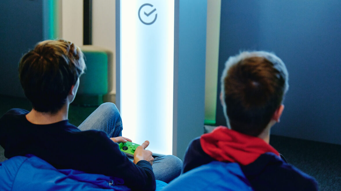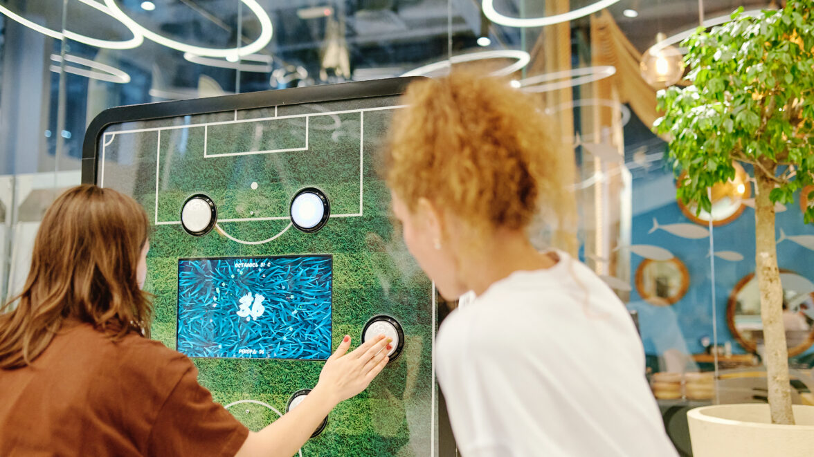 На втором этаже расположились зоны инноваций и робототехники под охраной робопса. Вместе с клиентом мы проработали интерактивы, которые помогали гостям проверить себя на внимательность, смекалку и скорость реакции.