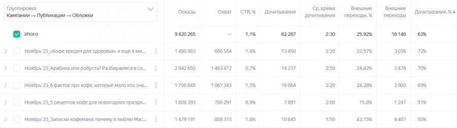 Статья о рецептах приготовления кофе не показала такой же эффективности, как остальные материалы в рамках кампании. Из-за этого мы перераспределили бюджет и приоритизировали остальной контент. Мы оптимизировали кампании: постепенно снижали ставку за дочитывание, активно мониторили CTR заголовков и обложек, отключали неэффективные сочетания, добавляли в тестирование новые варианты вручную. Что касается содержания статей, его не пришлось менять: аудитория проявила интерес и читала тексты до конца. Все статьи показали дочитываемость более 50%, при этом три из них превысили отметку в 70%.