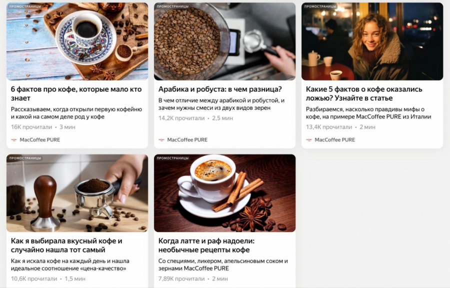 Специалисты агентства диджитал-маркетинга E-Promo, входящего в состав E-Promo Group, разработали серию статей на «Яндекс ПромоСтраницах» для продвижения зернового и молотого кофе MacCoffee Pure. Представители агентства рассказали Sostav, какой результат стал следствием сотрудничества с авторами и экспертами из индустрии кофе при создании контента.