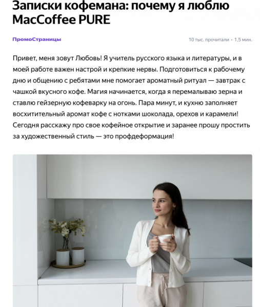 Для статьи о личном опыте использовали историю учительницы русского языка, которая любит кофе и ощущение бодрости. По совету подруги она приобрела зерна MacCoffee Pure, попробовала, вкус ей очень понравился. В тексте подсветили все основные УТП: рассказали о ценовых предложениях и особенностях обжарки, разнице между блендами — Arabica Crema и Espresso Forte, а также как заваривать напиток на завтрак. Эта статья по итогам привлекала больше всего трафика на маркетплейс.