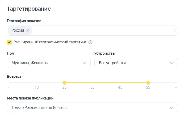 Для каждой статьи мы запустили отдельную рекламную кампанию со своими заголовками и обложками. Рекламные объявления размещались в рекламной сети «Яндекса». В настройках рекламных кампаний выбрали интересующие нас метрики, исходя из целей рекламы. Использовали следующие таргетинги: Россия, возраст от 25 до 55 лет, смартфоны и десктоп.