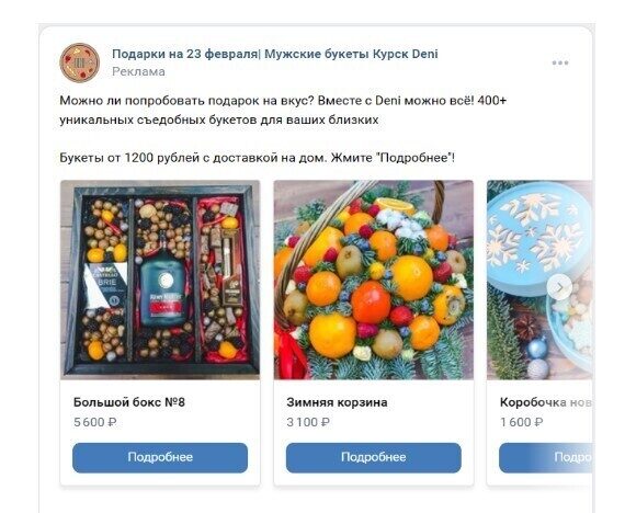 Люди из этой аудитории уже ищут конкретный съедобный букет или компанию, которая предоставит услугу по созданию композиции. Поэтому в рекламе транслируем решения потребностей людей и показываем наиболее популярные товары на основе статистики, а не метода подбора, как в формате «Карусель».