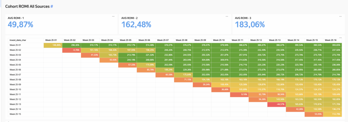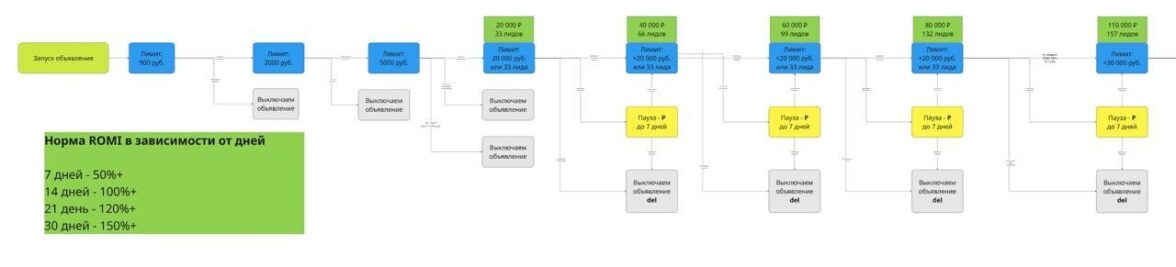 2. Наращивание рекламного бюджета на 15–25% ежемесячно без потери ROMI.