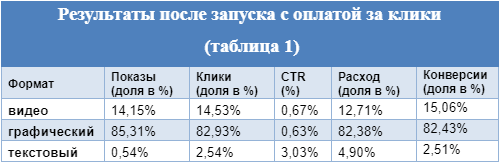 По данным в таблице видно, что по показам и кликам лидирует графический формат, около 14% занимает видеоформат, текстовый формат получил самую маленькую долю процента.