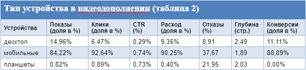 По таблице 2 видно, что мобильные устройства приносят до 84% показов и 92% кликов, конверсий почти в 89%. Примечательно, что на мобильных устройствах относительно большой процент отказов и самая низкая глубина просмотра. Скорее всего, это связано с показами в мобильных приложениях, где люди не могут попасть на крестик и проваливаются на сайт.