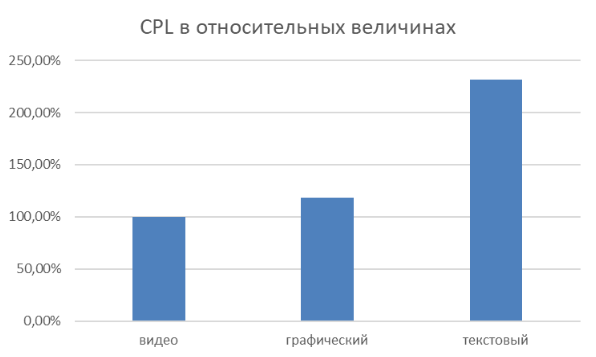 Если сравнивать цену конверсий, то видеоформат имеет колоссальное преимущество перед текстовым форматом и незначительное преимущество перед графическим форматом. В графике брали за 100% цену самого нижнего значения, а именно видеоформата.