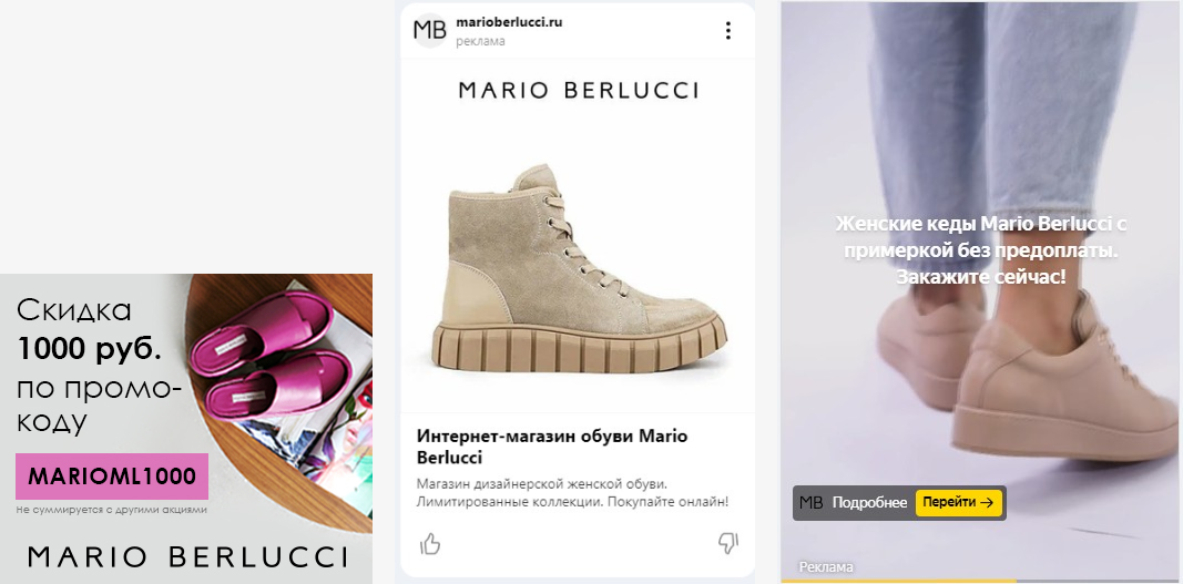 Контекстная реклама продолжает по сей день быть первым инструментом взаимодействия и драйвером продаж. Этот подход к ведению бизнеса отличает компанию от конкурентов. Если большинство обувных компаний делают ставку на развитии бренда и запускают медийные флайты, то в основе продвижения Mario Berlucci лежит performance-маркетинг.