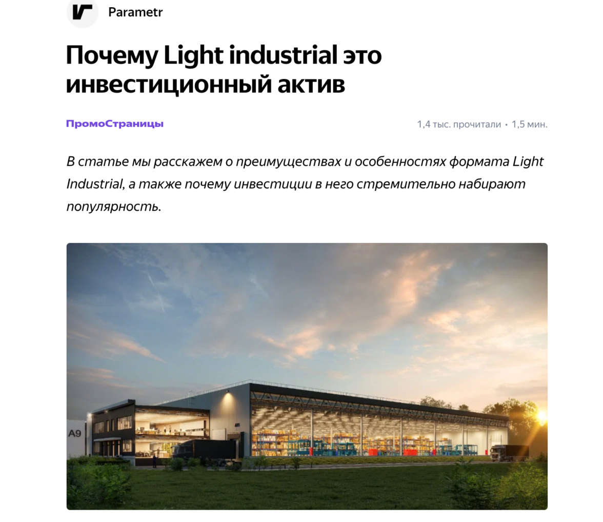 Материал про новый формат недвижимости для производств принес несколько десятков лидов, а его дочитываемость была 47%. В декабре 2023 года мы решили протестировать еще одну статью на более узкую аудиторию инвесторов: «Почему Light industrial это инвестиционный актив».