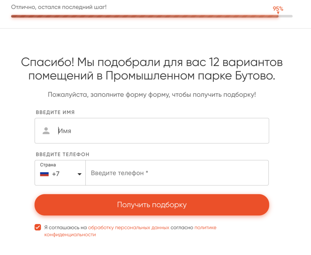 В конце квиза мы запрашивали у пользователей имя и телефон, а затем связывались с ними и отправляли персональную подборку помещений: