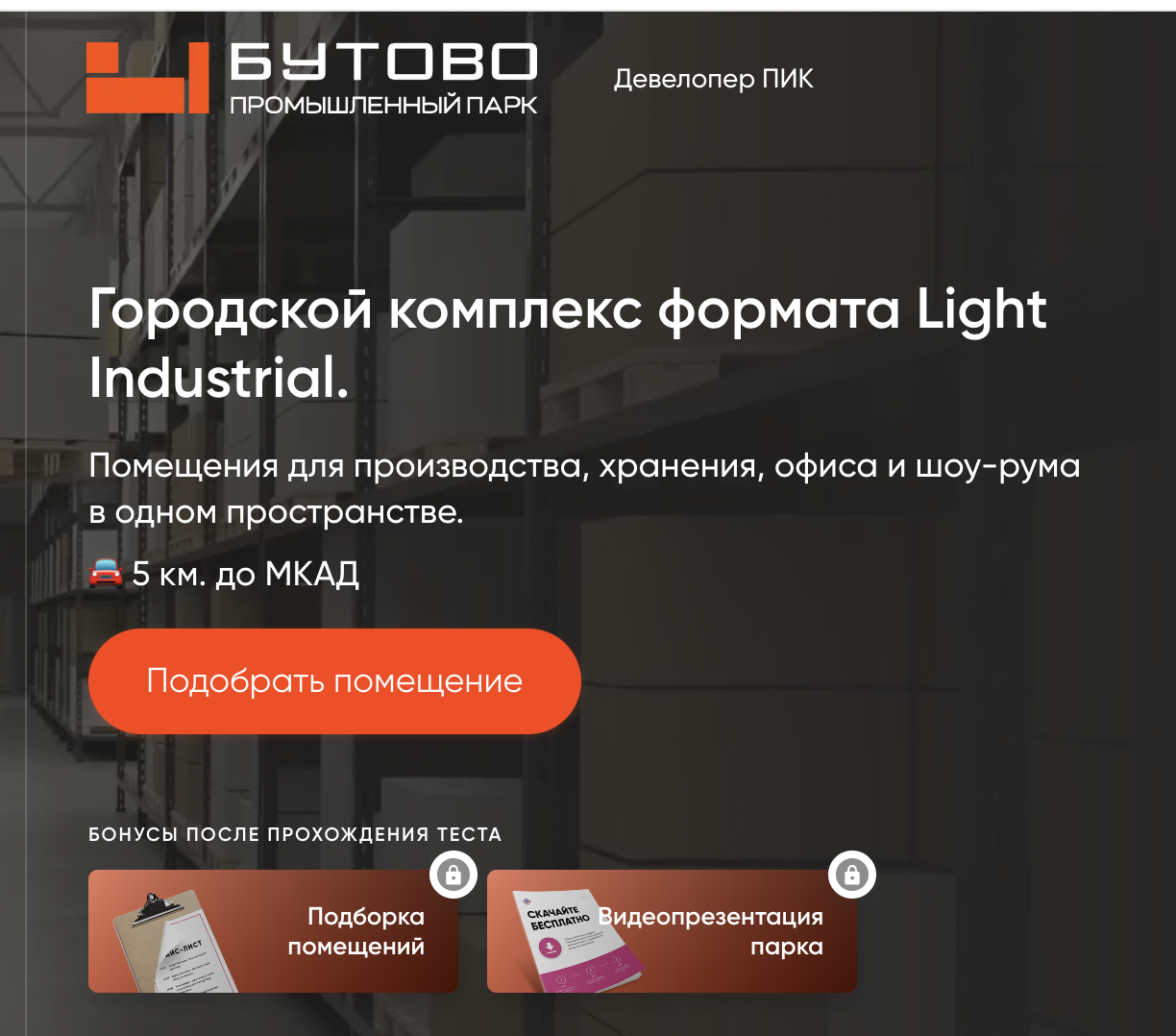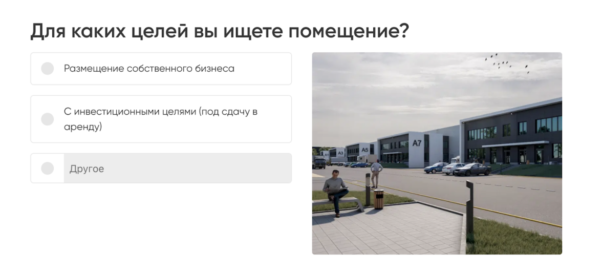 На посадочной странице мы предложили пользователям пройти квиз, который помогал подобрать варианты помещений: