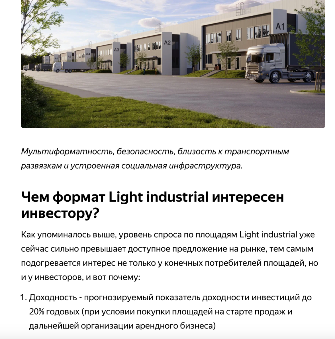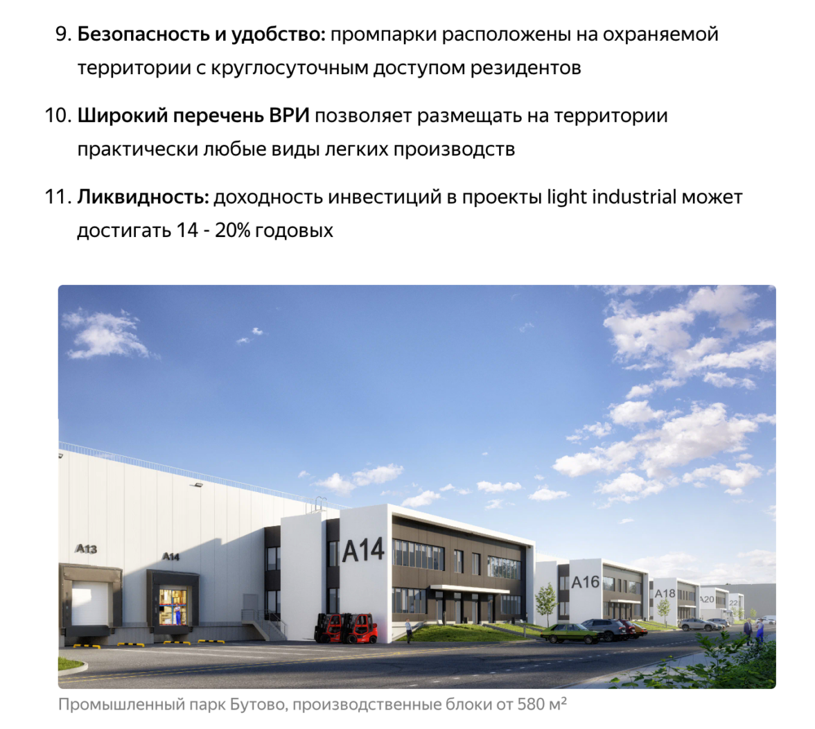 В ней тоже перечислили преимущества современных промышленных парков, показали вид помещений на рендерах, а также рассказали, чем формат Light industrial может быть интересен инвестору.