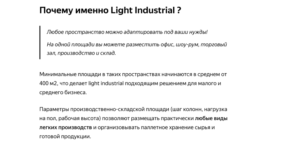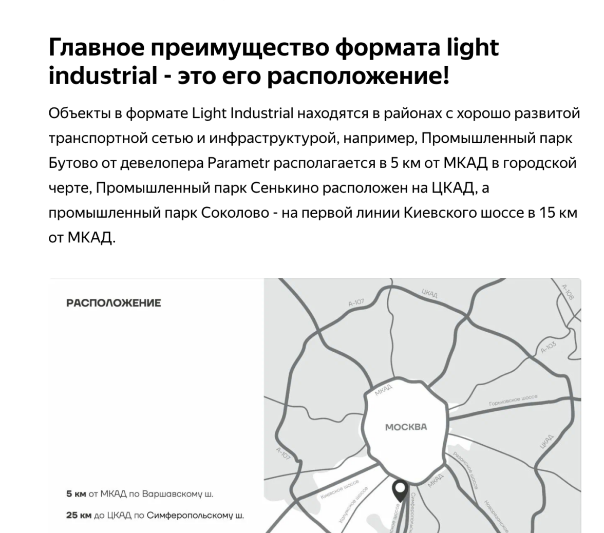 В контенте мы учли УТП клиента: девелопер Parametr строит современные, промышленные парки, которые находятся в городской черте и обладают хорошей транспортной доступностью. При составлении текста подробно описали все преимущества промышленных парков и сделали на них акцент в статье: