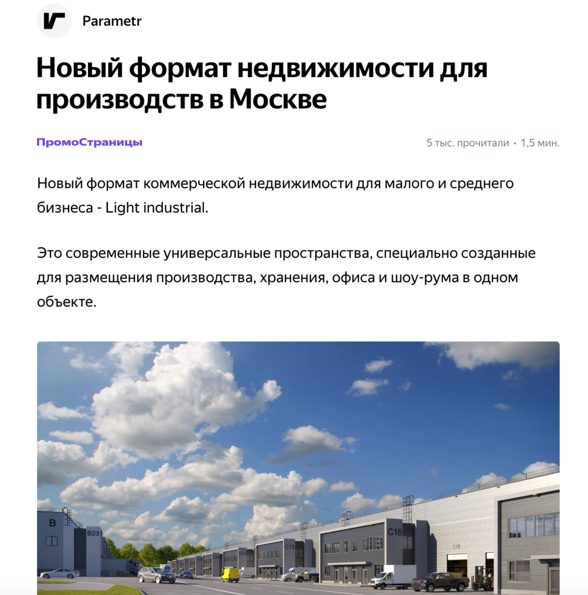 Поскольку большая часть парков находилась на стадии строительства, мы размещали в статьях рендеры с визуализацией, как эти помещения будут выглядеть. На рендерах показывали как внешний вид зданий, так и интерьер, расположение склада, офиса, производства: