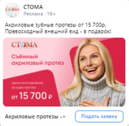 При запуске таргетированной рекламы для стоматологических клиник рекомендуем использовать креативы с изображением рекламируемой процедуры (услуги). Это помогает повысить конверсию в заявку.