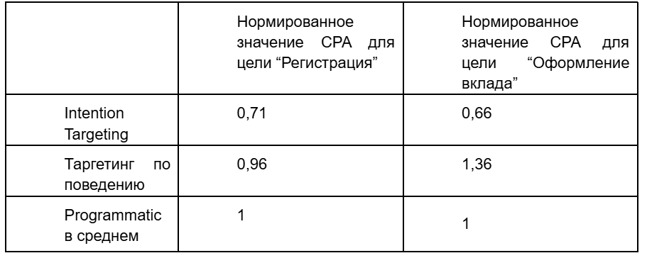 Как считали: средний СРА по programmatic приравняли к 1. Из него высчитали индекс по Intention Targeting и стандартному размещению. СРА Intention нормированный = СРА Intention/СРА средний, аналогично высчитали нормированный СРА для таргетинга по поведению.