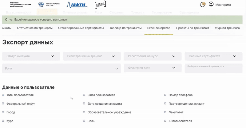 Подготовка отчетности в Министерство образования: включает детализированные данные о посещаемости тренингов и выданных сертификатах. Цифровая система отчетности упрощает работу организаторов и дает точные данные, что является важным требованием федерального проекта.