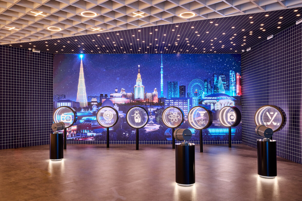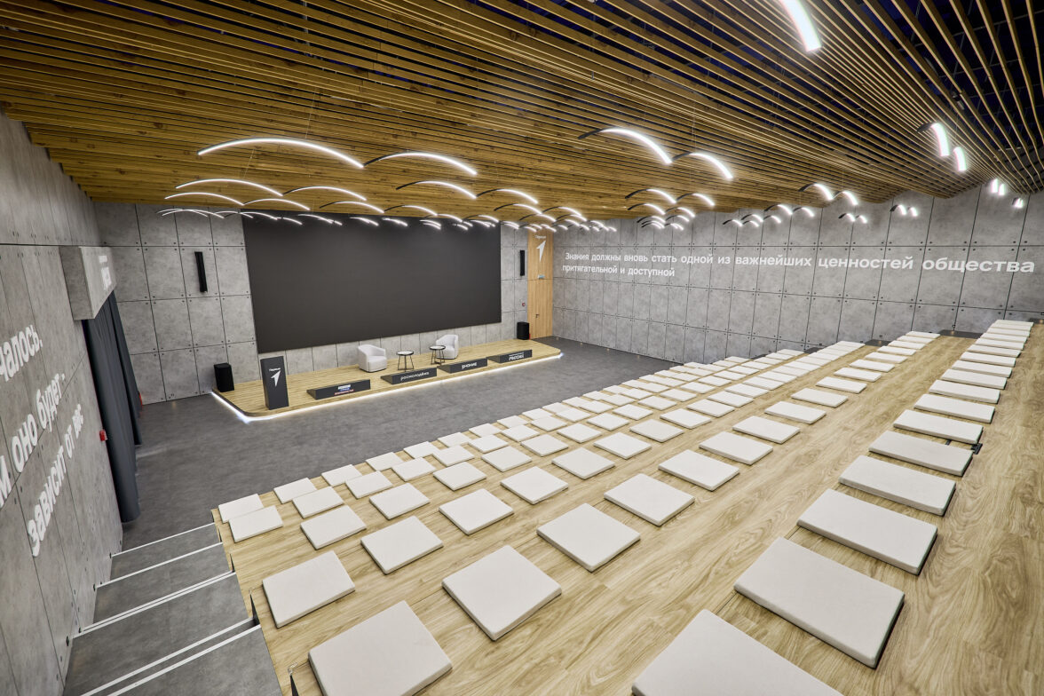 Пространство выстроено по принципу современного студенческого кампуса. Интерьер наполнен визуальными отсылками к культурному наследию России и современным цифровым трендам. Такой дизайн позволил органично интегрироваться в общую урбанистическую структуру Москвы, а зеркальные стены позволяют наблюдать за процессом создания контента.