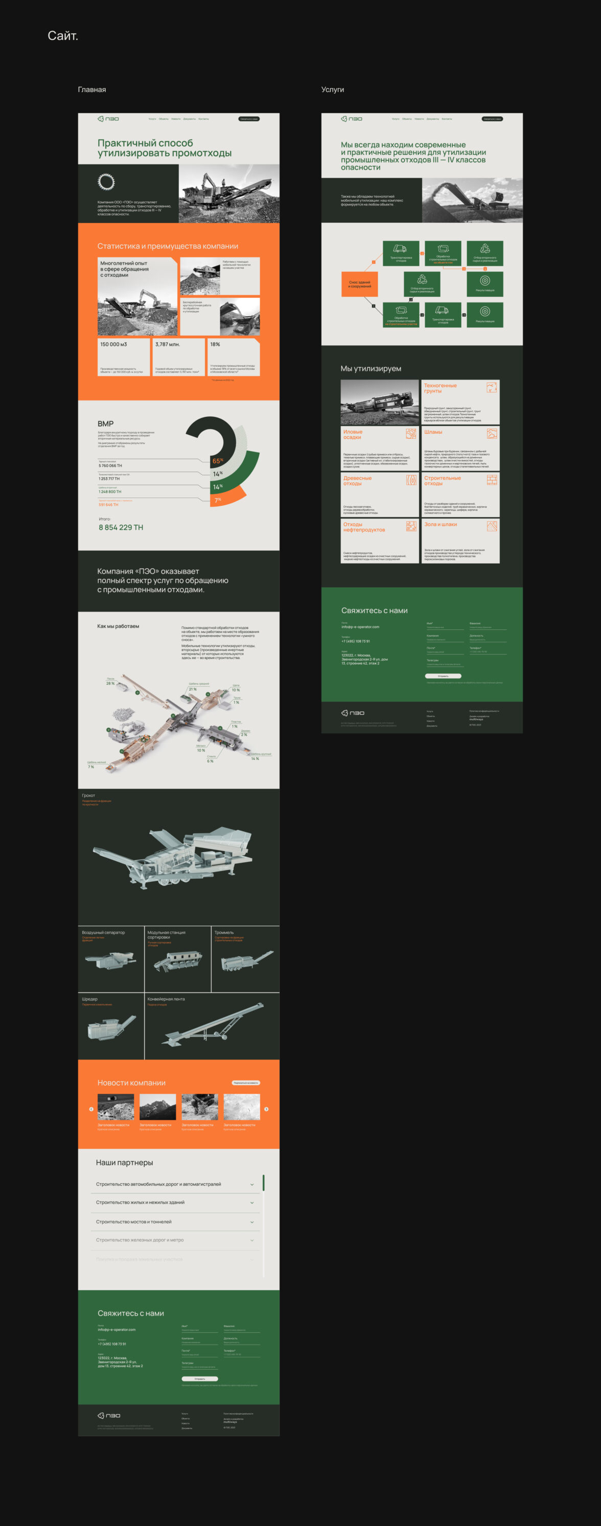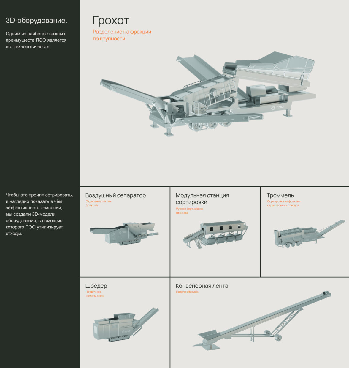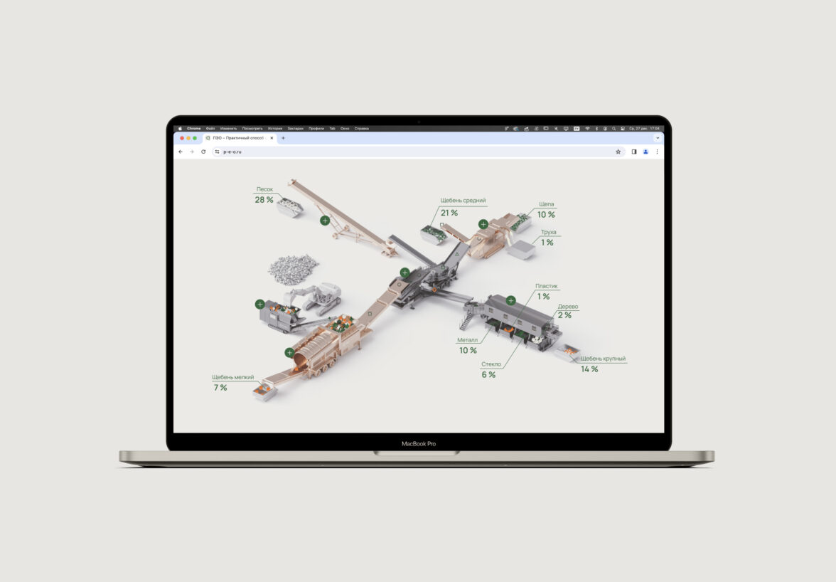 Для отображения оборудования и схемы переработки мы смоделировали 3D-элементы в промышленных металлических материалах и продемонстрировали наглядную схему переработки. С помощью всплывающих подсказок на сайте рассказали обо всех технических характеристиках каждого типа оборудования и в итоге получили лаконичный и выразительный результат.