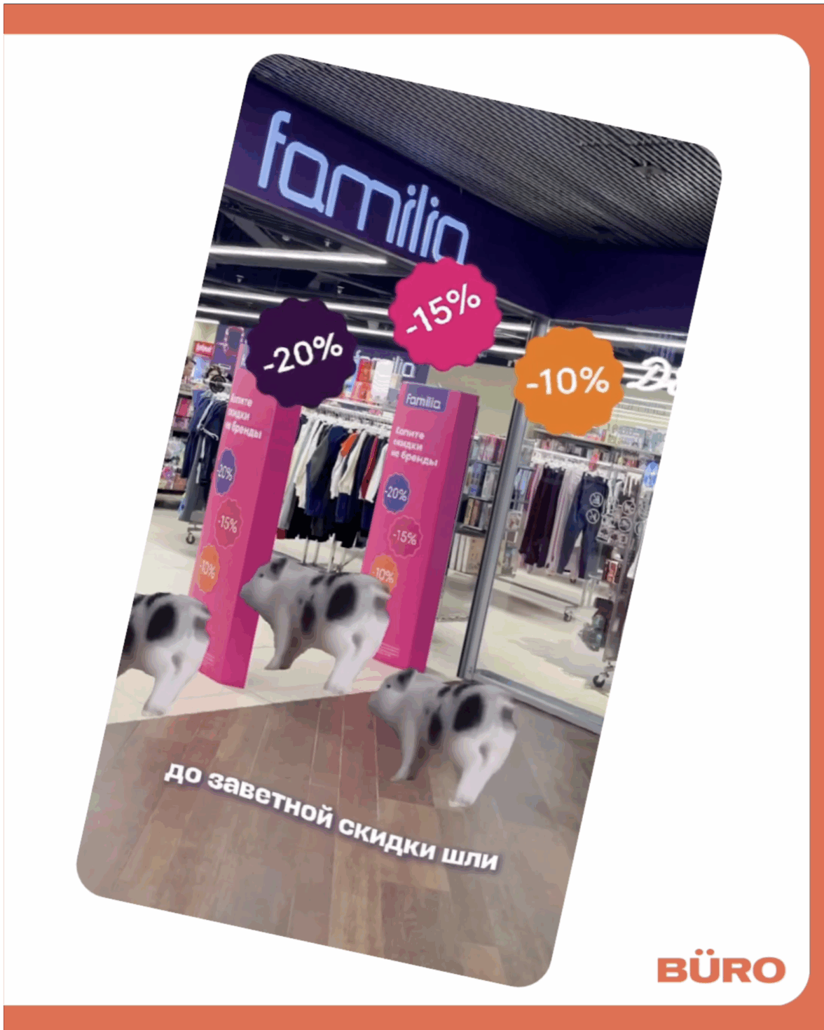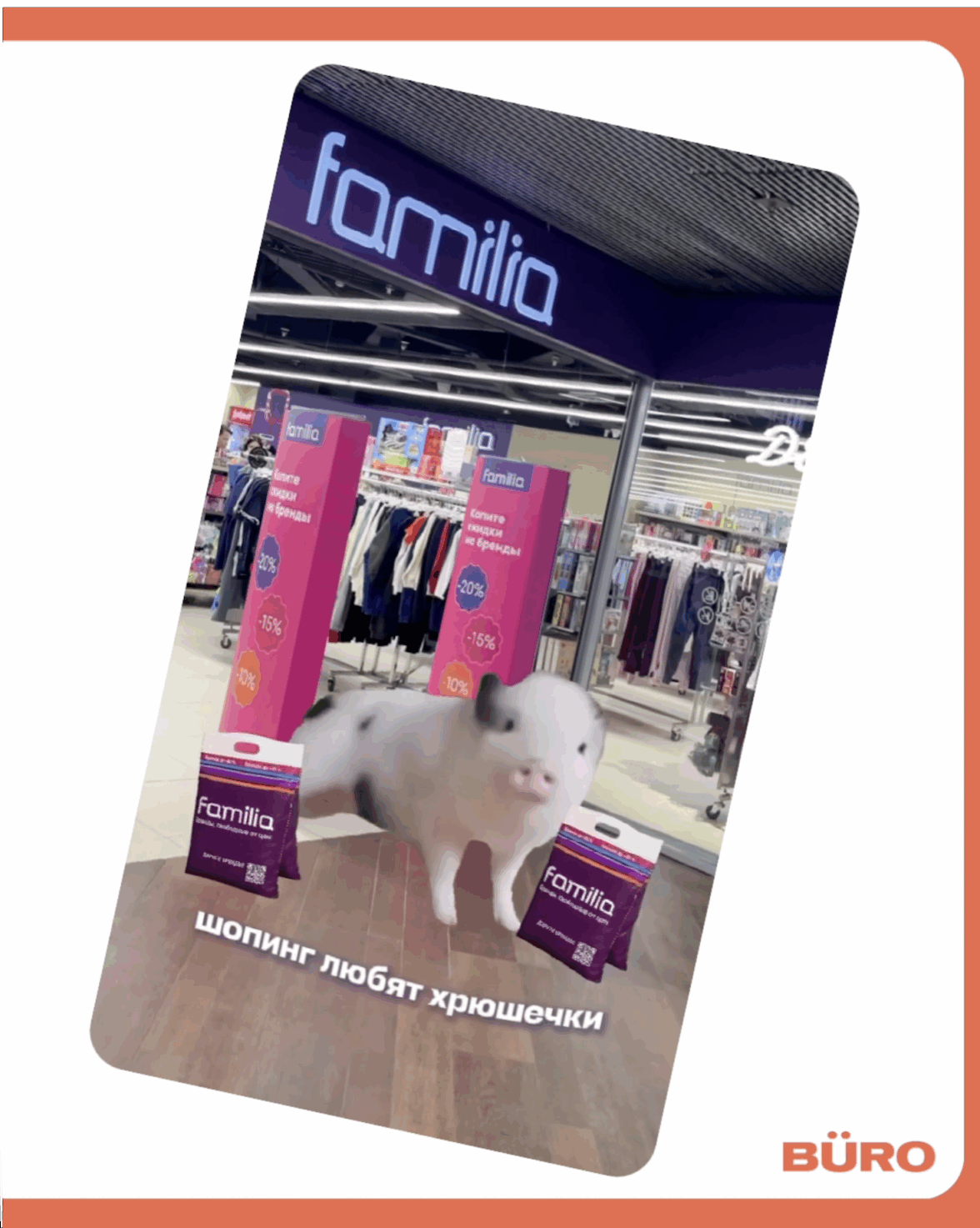 Также мы адаптировали видеоряд и визуализировали свинок, которые приходят в магазин Familia c акционными наклейками и выходят с покупками.