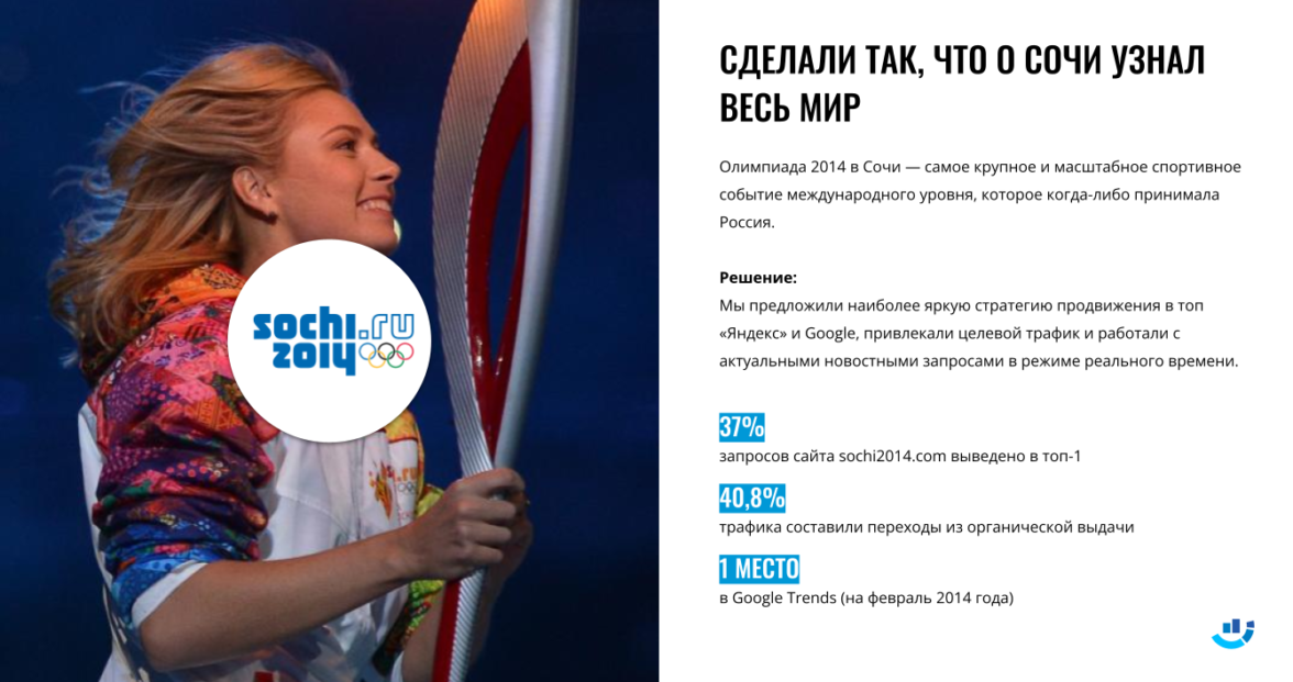Миссия состояла в том, чтобы популяризировать олимпийские игры в Сочи на 5 веб-сайтах, включая основной домен sochi2014.com, tickets.sochi2014.com для продажи билетов, talisman.sochi2014.com для символики и других важных элементов. Для этого необходимо было продвинуть мероприятие в топе Яндекса и Google и привлечь целевую аудиторию. Более того, было важно работать с новостными запросами в режиме реального времени.