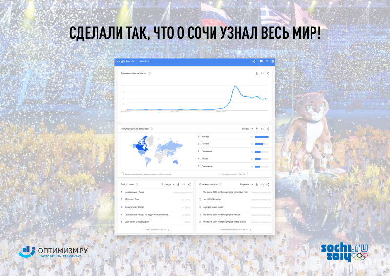 В урожайном 2012 году мы выиграли замечательный тендер — Олимпиада 2014 в Сочи. Мы были настолько взбудоражены, что изучали проект с утра до ночи. Сразу подчеркнем, что мероприятие такого масштаба — это событие, которое случается только раз в 4 года (последняя Олимпиада (летняя) была в 2010 году). Wordstat не обладает способностью сохранять информацию в течение столь длительного времени. Нам пришлось использовать сочетание смежных запросов и нашего личного экспертного мнения.