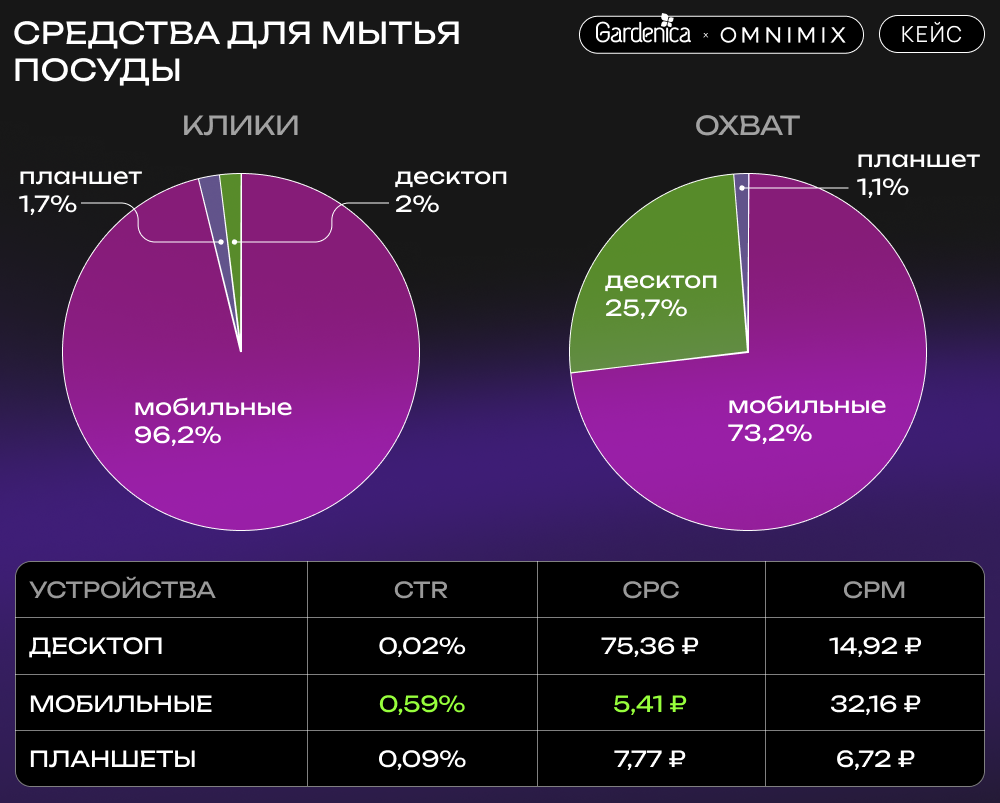 Кампания по средствам для мытья посуды показала высокую эффективность на мобильных устройствах, что подчеркивает необходимость фокусироваться на мобильных платформах в будущих кампаниях.