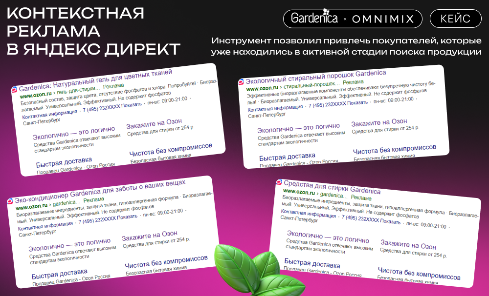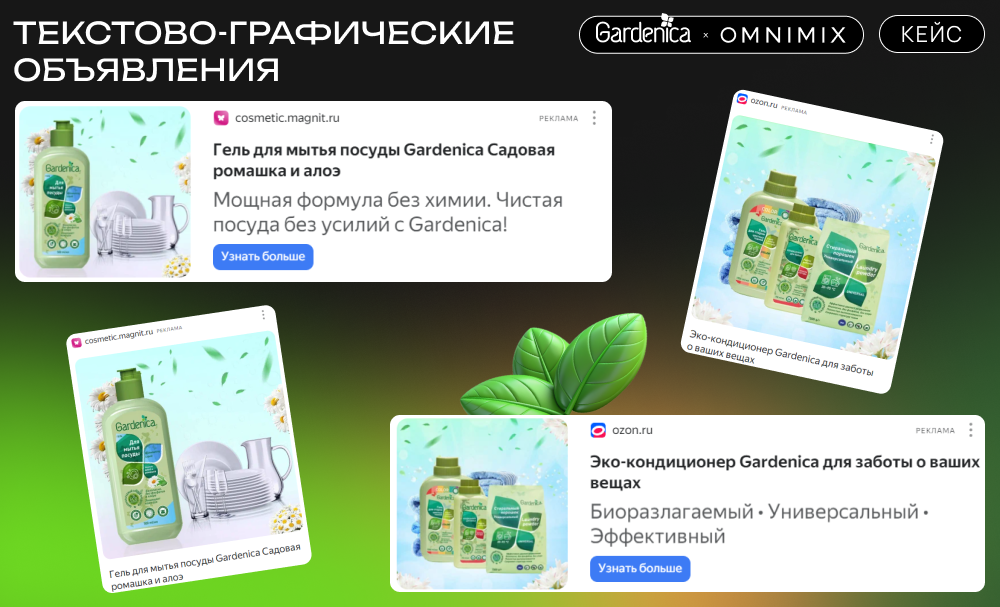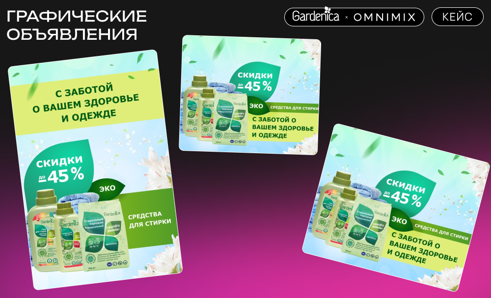Кампания Gardenica, реализованная агентством OMNIMIX, подтвердила, что экологичность и натуральность продуктов — это мощные драйверы потребительского интереса, особенно в сегменте бытовой химии. Комбинированное использование контекстной и медийной рекламы с акцентом на мобильные устройства позволяет достичь высоких показателей вовлечённости и конверсии. Гибкость в выборе рекламных форматов и каналов помогла обеспечить широкий охват и высокий уровень вовлечённости на всех стадиях принятия решения о покупке.