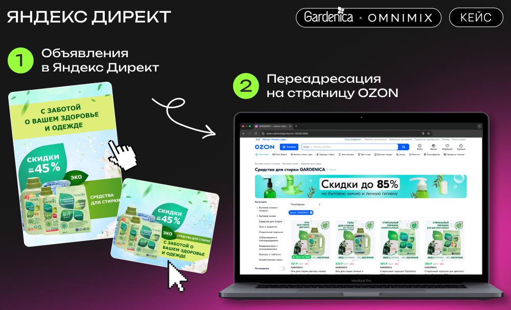 Все рекламные кампании вели на страницу Ozon, что минимизировало количество шагов для пользователей и способствовало росту конверсий. Такой целостный и стратегически выверенный подход позволил добиться значительного увеличения продаж продуктов Gardenica на маркетплейсе.