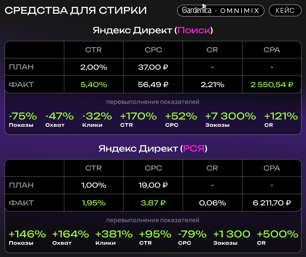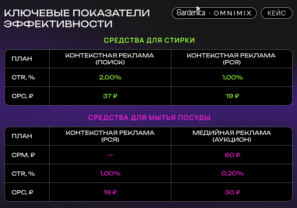 В то же время контекстная реклама на Поиске обеспечила высокие конверсии, особенно для средств для стирки, что подчёркивает важность гибкости в выборе каналов в зависимости от целей кампании.