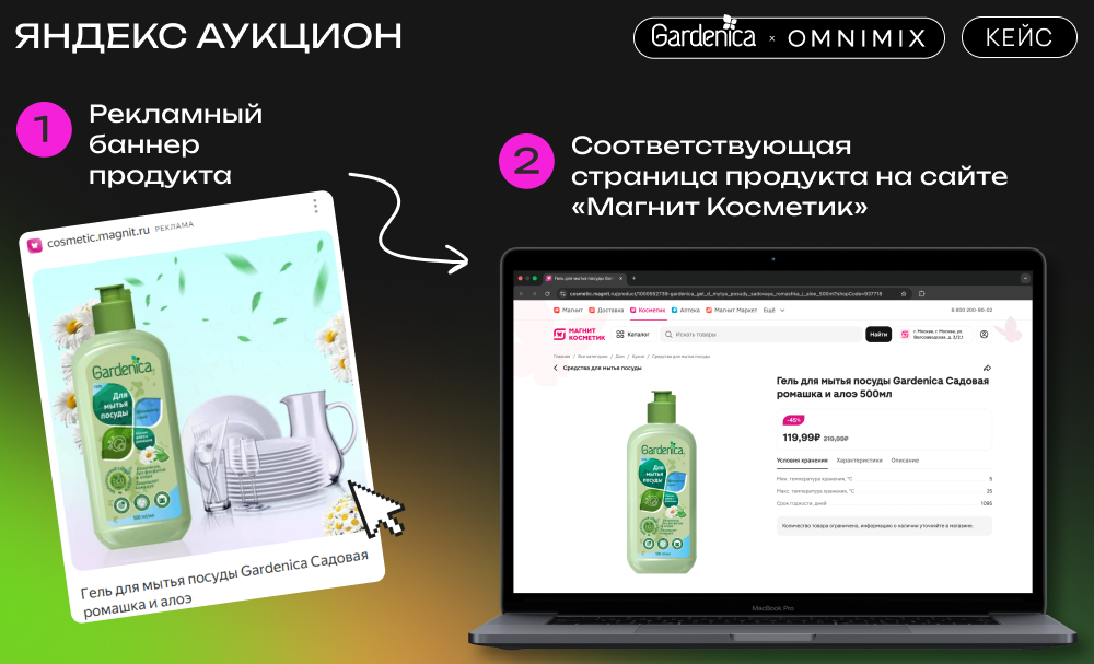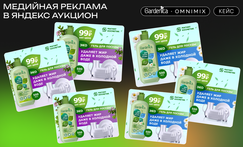 Медийная реклама в Яндекс Аукцион. Для продвижения гелей для мытья посуды использовали медийные форматы в Яндекс Аукционе. Этот инструмент обеспечил максимальный охват и высокую частоту показов, что значительно повысило узнаваемость бренда и стимулировало офлайн-продажи в сети магазинов «Магнит Косметик». Медийная реклама позволила донести до целевой аудитории ключевые преимущества продукта, такие как доступная цена в 99 рублей и уникальные ароматы, что сделало продукт более привлекательным для потенциальных покупателей.