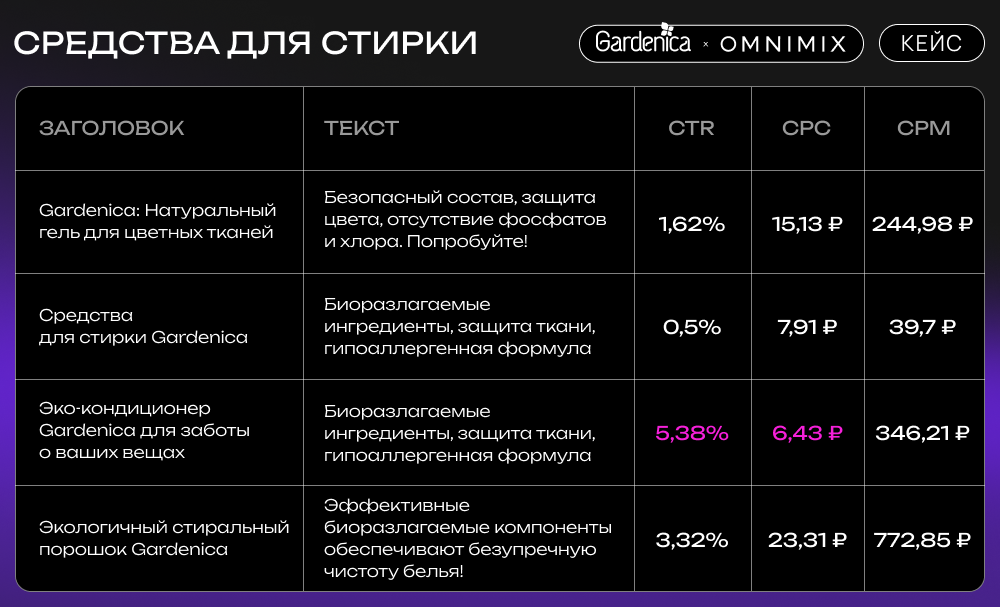 Экологичный стиральный порошок Gardenica также показал достойные результаты с CTR 3,32%. Этот продукт оказался эффективным в плане вовлечения аудитории, хотя и имел более высокую стоимость клика.