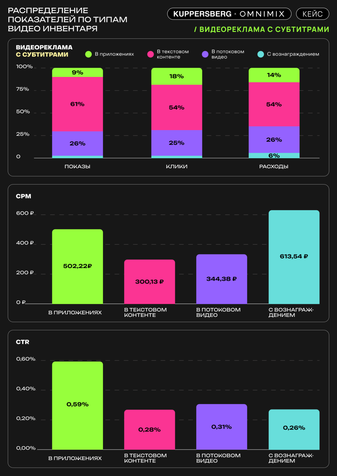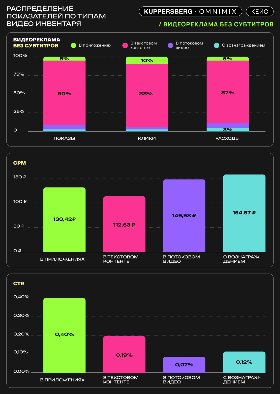 Приложения. Увеличение доли показов и кликов в приложениях привело к наибольшему CTR — 0,59%, что свидетельствует о высокой вовлеченности аудитории, особенно при использовании субтитров.
