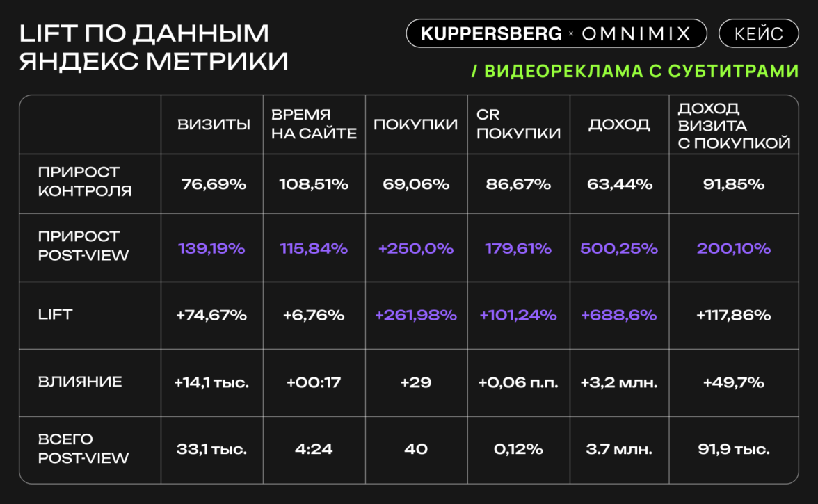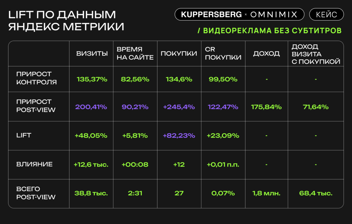 Рост ключевых показателей. Показатели Lift и приросты post-view по таким метрикам, как визиты, время на сайте, конверсии и доход, показали, что кампания с субтитрами успешно привлекала целевую аудиторию и стимулировала активное поведение на сайте. Особенно примечателен прирост дохода в post-view на +500,25% и увеличение дохода от визитов с покупкой на +200,10%, что свидетельствует о значительном влиянии субтитров на конечные финансовые результаты.