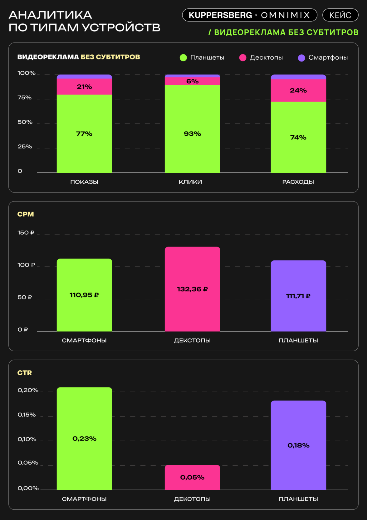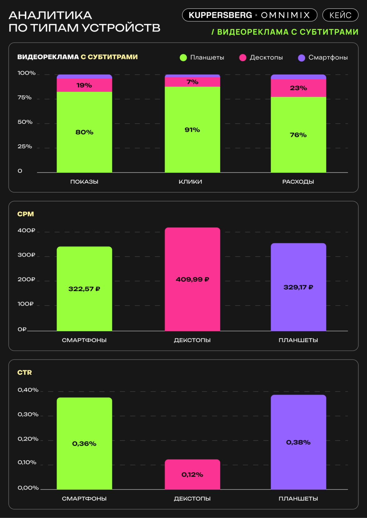 Десктопы. На десктопах наблюдался высокий CPM — 409,99 рубля, однако CTR остался низким — 0,12%, аналогично предыдущей кампании без субтитров.