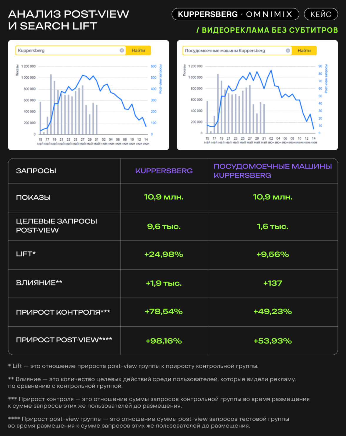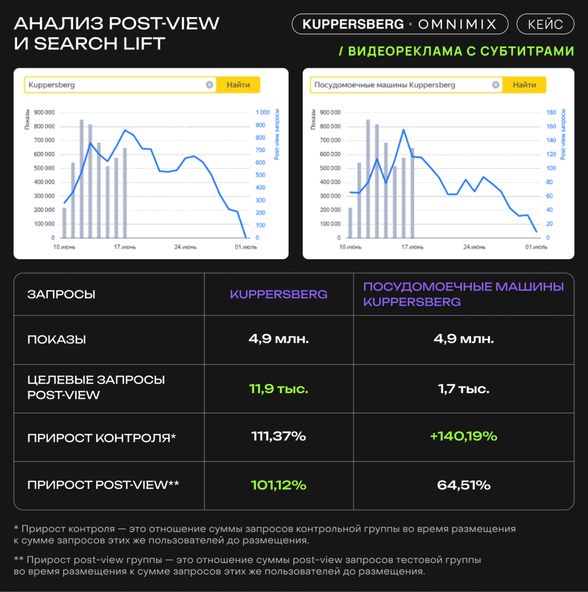 Рекламная кампания с субтитрами достигла высоких результатов как в охвате, так и в воздействии на аудиторию. Она способствовала значительному увеличению запросов как в контрольной, так и в post-view группах. Особенно эффективным оказался брендовый запрос «KUPPERSBERG», по которому было зафиксировано 11,9 тысячи целевых запросов post-view и прирост post-view на уровне 101,12%. Запрос «Посудомоечные машины KUPPERSBERG» также показал прирост контроля на уровне 140,19%, что свидетельствует о значительном интересе со стороны пользователей, которые не видели рекламу, но активность этих пользователей была ниже по сравнению с теми, кто видел рекламу.