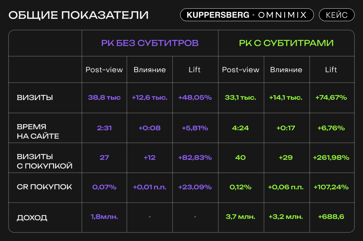 Представленная таблица сравнивает ключевые показатели эффективности рекламных кампаний KUPPERSBERG с субтитрами и без них. Несмотря на меньшую продолжительность, кампания с субтитрами продемонстрировала лучшую эффективность по всем основным метрикам.