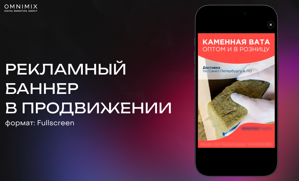 Предмет рекламы. Для продвижения выбрали один из основных продуктов клиента и разработали баннер в формате Fullscreen. Главный плюс такого формата — возможность подготовки и запуска бóльшего числа материалов для ротации и тестирования креативов.
