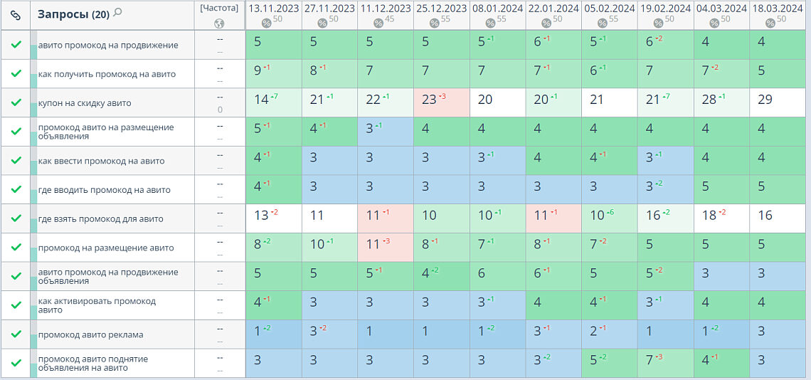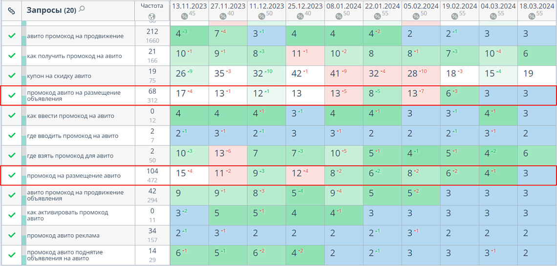 В Google статья «Промокод Авито на продвижение: как получить и куда вводить купон?» сохранила и улучшила позиции по большинству запросов, а по некоторым ухудшила. Мы увидели в этом стагнацию, поэтому решили улучшать статьи с точки зрения критериев качественного контента Google и настраивать перелинковку с тематическими статьями
