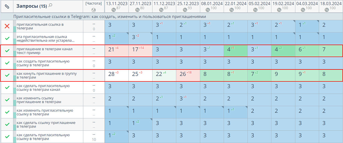 Пришли к такому результату за счёт того, что новые статьи повысили позиции в поисковой выдаче. Динамику отследили по Топвизору. Ниже приведена статистика по нескольким материалами за период с ноября 2023-го по март 2024-го года.