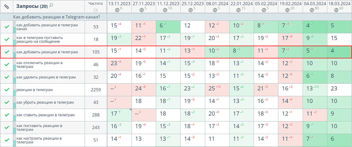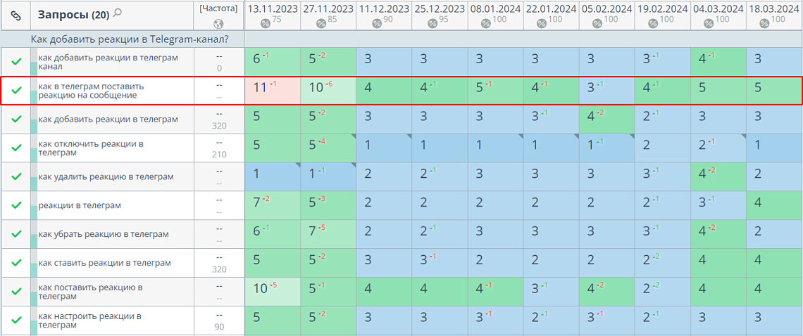 Статья «Как добавить реакции в Telegram-канал?» в течение четырёх месяцев повышала позиции в поисковой выдаче Яндекса. Например, по запросу «как добавить реакции в телеграм» статья переместилась с 15-го на 4-е место