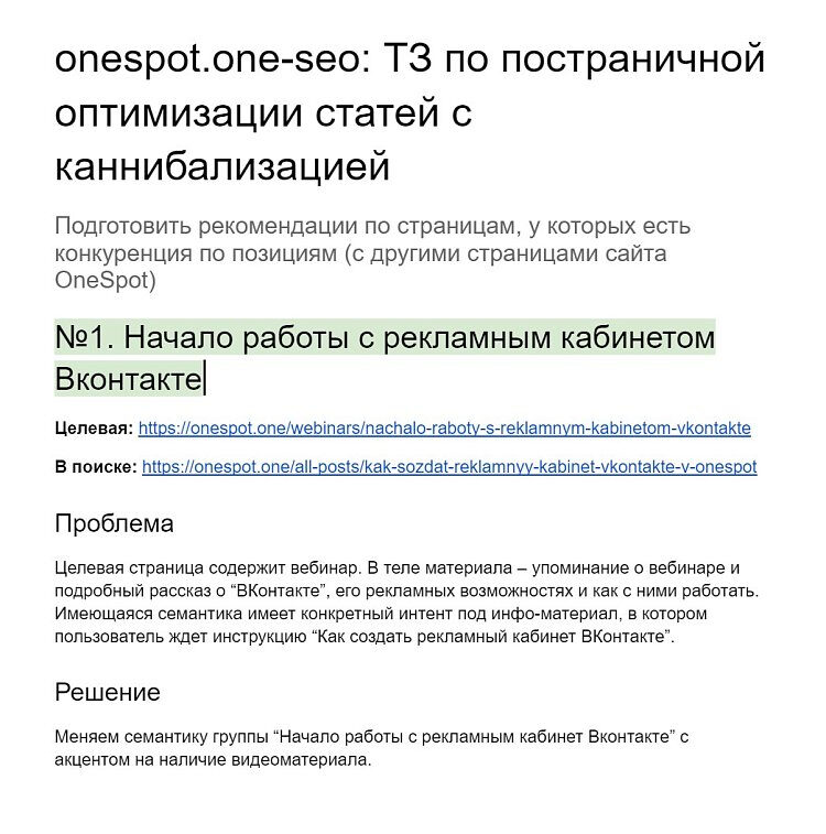 Для статей со схожим содержанием и оптимизированных по одному ключу дали рекомендации, что изменить, чтобы страницы не конкурировали друг с другом и не ухудшали тем самым позиции сайта в поисковой выдаче