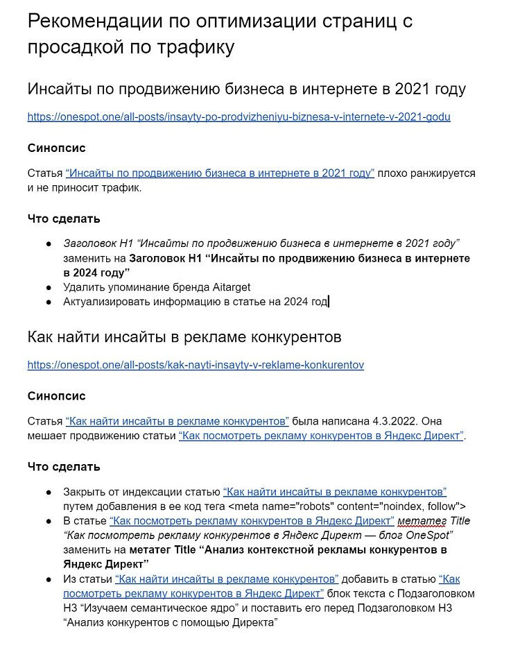 Для статей с сильно просевшей посещаемостью дали рекомендации, как улучшить их с точки зрения SEO, чтобы вернуться к росту трафика. Например, заменить заголовки, обновить отдельные части текста или закрыть от индексации материалы по смежным темам, которые мешают продвигаться более новым