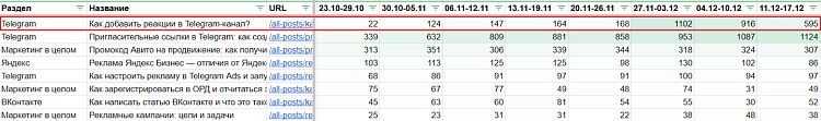 Таблица движения трафика показывает, как рос его объём в актуализированных материалах. Например, число посещений статьи «Как добавить реакции в Telegram-канал» выросло с 22 до 595, то есть в 27 раз