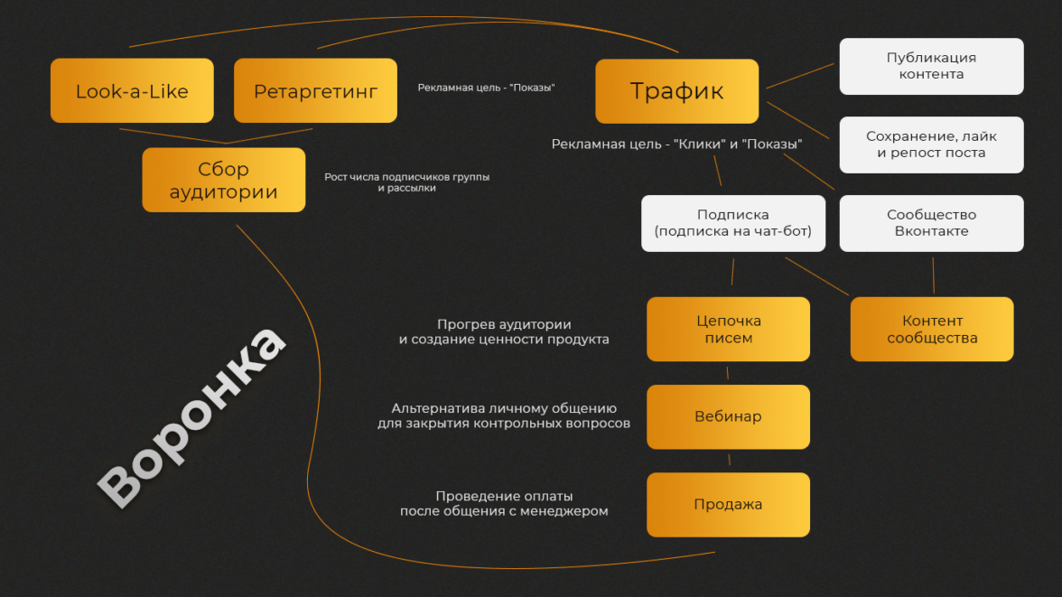 7. Создали воронку трафика во ВКонтакте. Воронка помогает видеть, куда ведем трафик и на каких этапах задействовать ретаргет, чтобы вести клиента к подписке с минимальными вложениями.