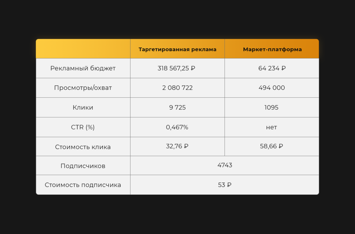 Этот формат рекламного объявления сработал лучше всего. С него мы получили подписчиков по 40–50 ₽.