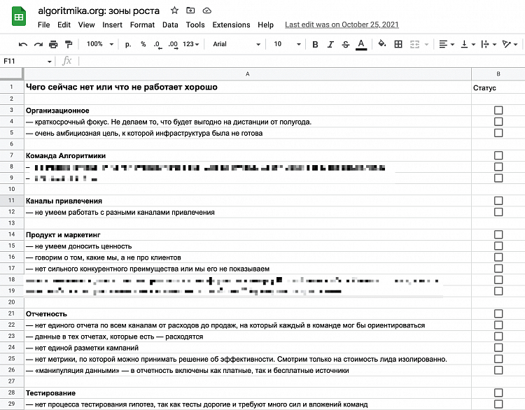 Провели стратсессию, по итогам которой обозначили основные зоны роста: команда, процессы, продукт, каналы привлечения, отчётность