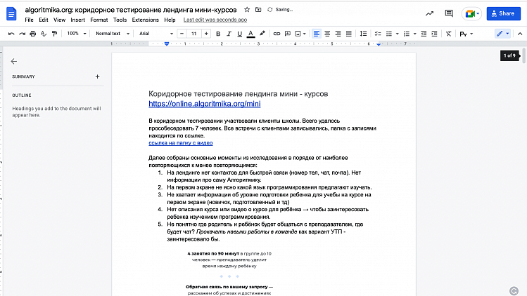 После запуска нового лендинга мы провели коридорное тестирование: опросили семь клиентов, с точки зрения UX и наполнения сайта. Результаты опросов оформили в рекомендации по улучшению лендинга