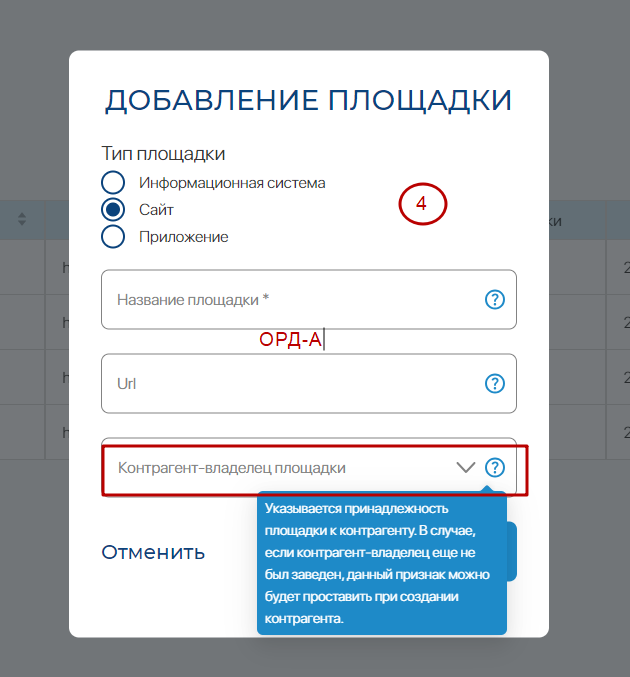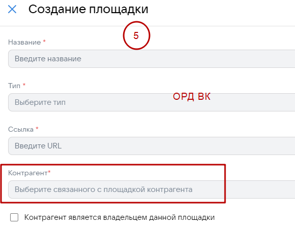 В ОРД-А при занесении Площадки поле Контрагента есть, но указывать его не обязательно (слайд 4).