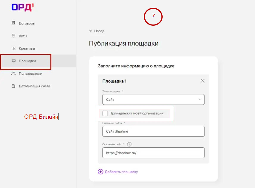 В ОРД Билайн также можно занести площадку без привязки к Контрагенту (слайд 7).