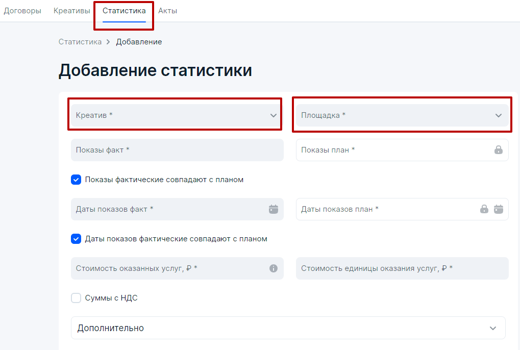 На примере ОРД Озон стандартная отчетность с разаллокациями по креативам и площадкам в блоке Статистика выглядит следующим образом.